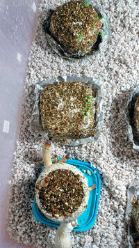 Os bolos acabaram por ficar quase 24h no "dunk" no frigorifico. Já com a vermiculita à temperatura ambiente, passei todos os bolos por água corrente, inclusive o que tinha ficado no terrário no dia anterior, e de seguida coloquei-os dentro da travessa para fazer o "roll". Usei folha de alumínio para criar uma base para cada um e a seguir foram colocados no terrário e borrifei as paredes com água da torneira, ficam as fotografias: