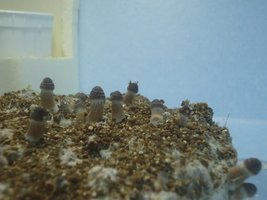 Boa Tarde Cm´s... hj fui dar uma olhada pela janelinha e vi que o micélio tinha tomado conta daquela parte amarela que cutuquei com a pinça, achei impressionante pq fi mto rapida, se era alguma contaminação sumiu, esta um branco bonito e forte por cima do local que ficou o buraco amarelado da pinça... aproveitei e registrei algumas primordias... até o fds deve ter mais alguma atualização...valeu galera, agora estou mais tranquilo com esse bolo, e ja decidi que nao vou mais dunkar ele, mesmo sendo visivel que foi bom o dunk-coldschock, mas vou deixar pra hidratar internamente o bulk com seringa e agulha assim da pra injetar bastante agua com a serina esterelizada, sem precisar colocar agua na bacia toda.... valeu